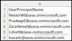 The CSV file should contain the list of users to be deleted in the format shown below, with UserPrincipalName as the column header as shown below. Providing a different header name may result in an error.