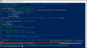 The script will connect to the site using PnP PowerShell, enable content approval if it’s not already configured, and then set the draft item security based on the visibility value you specify. Set the value according to your requirement: